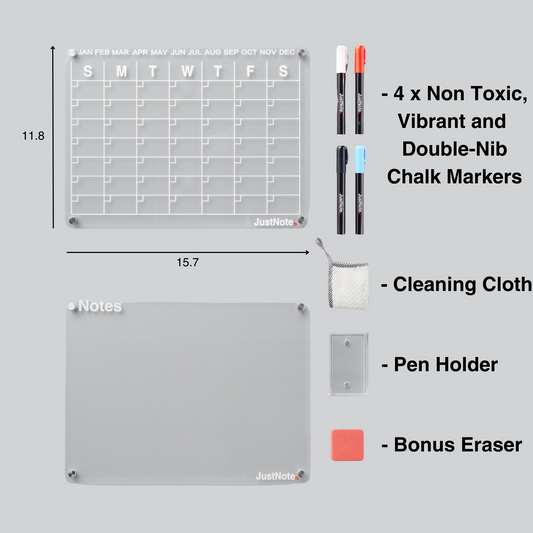 2 Piece Magnetic Clear Acrylic Fridge Calendar Board - Family Planner - Non Scratch Magnets - Wipe Clean with Vibrant Non Toxic Liquid Chalk Markers - Dry Erase Planning board for your refrigerator